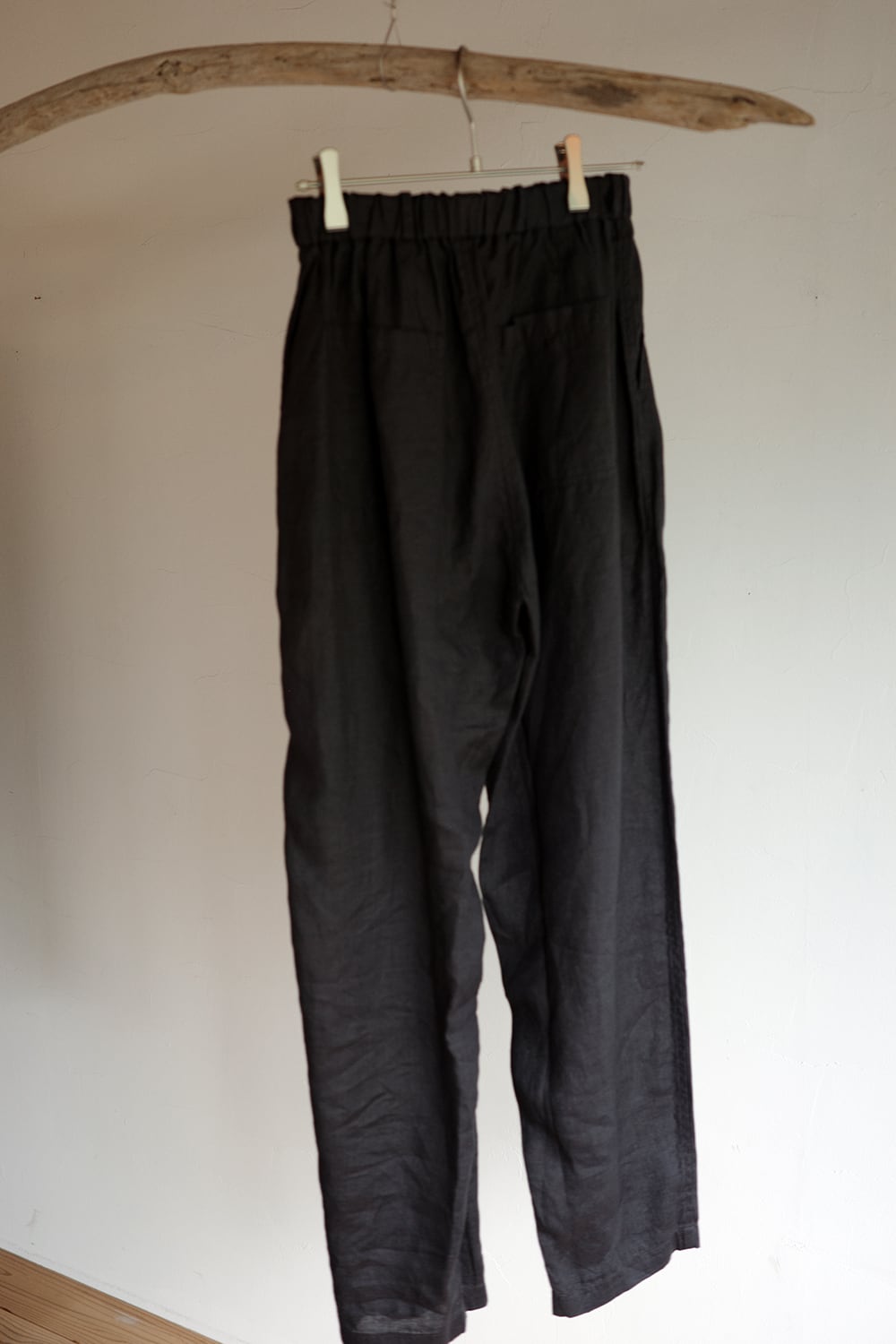 大麻100%の糸を経糸、緯糸に使用しています。大麻は強靭な繊維ですが、経年変化で肌に徐々に馴染んでゆき、麻から綿のような質感の変化が楽しめます。大麻の特性であるひんやりとした触感は洗濯を繰り返しても継続し、真夏でも快適に着用が可能です。大麻布の歴史については近世麻布研究所所長 吉田真一郎氏の記事に、大麻・苧麻・亜麻の違いはボーケンさんの記事に詳しいので参照ください。ベルトループが付いていますが、ウエストゴムと内側の製紐したオリジナルの紐(京都・宇治)で、ベルトを用いなくても着用が可能です。比較的強めのテーパードが入っていて、スッキリとしたシルエットとなっています。ロールアップでの調整も可能です。