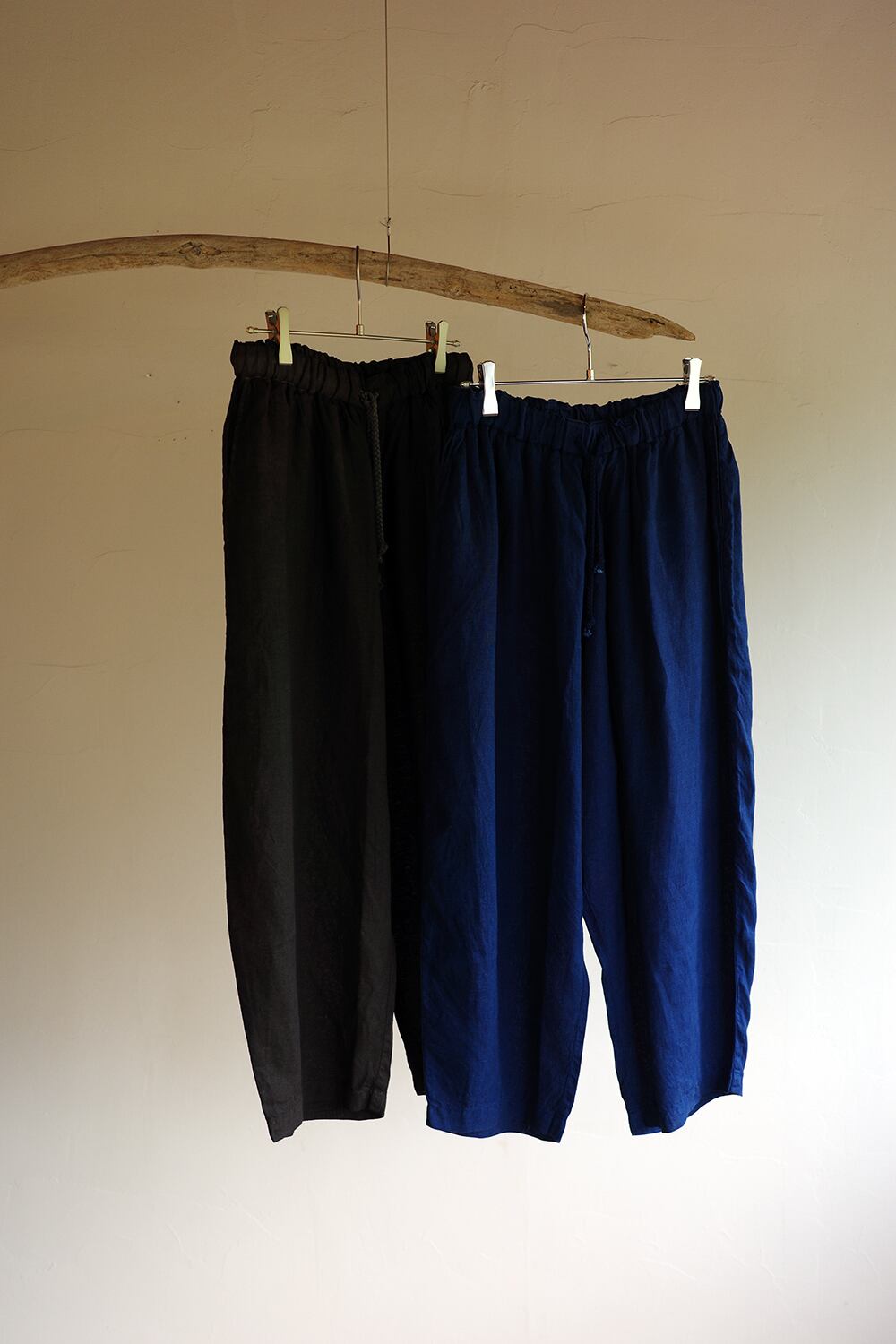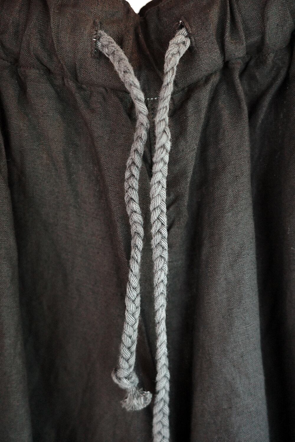 大麻100%の糸を経糸、緯糸に使用しています。大麻は強靭な繊維ですが、経年変化で肌に徐々に馴染んでゆき、麻から綿のような質感の変化が楽しめます。大麻の特性であるひんやりとした触感は洗濯を繰り返しても継続し、真夏でも快適に着用が可能です。 自重と携行物の重さに耐えられるようにベルトループを付けていますが、ウエストゴムと紐でベルトを用いなくても着用が可能です。パターンはもんぺやたっつけを参考にしています。股上は深いものの、運動量を確保しているので動きやすいのが特徴で、膝から裾にかけて入っている急なテーパードは、ロールアップによって調整が可能です。機能性を備えながらもシンプルなデザインの為、体型を問わず好みのサイズ感を選んでいただけます。腰紐には京都・宇治で製紐したオリジナルの紐を、縫製にはロックミシンに至るまですべて綿糸を使用しています。