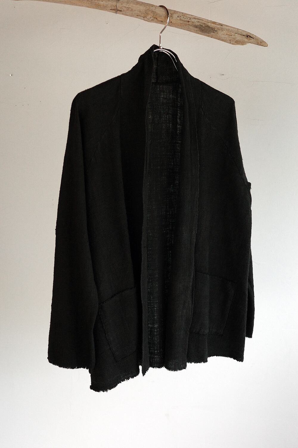 地元の職人をサポートしながらインド・カッチ地方の伝統品や技術を世界に発信することを目的としたNGO「Khamir」。彼らが手掛けるkalaコットンの詳細はこちらを参照ください。kalaコットンの原綿は品種改良のされていない原種のヘルバケウム種で、農薬を必要とせず、水も少量で済むため非常に環境負荷が低いのが特徴です。SNとはシングルニードルの略で、ガンジーが発案した家庭用のポータブル紡ぎ機の呼称になります。糸紡ぎの様子はこちらをご覧ください。現在シングルニードルよりも生産性の高い、アンバーチャルカが主流な中、現地の村の女性たちの手によって少しずつ糸が紡がれ、手織りで織られています。時折ランダムに生じるボーダーは手仕事の細かな糸のロットの変化によって生まれ、それも特徴の一つとなっています。 衿端に生地耳をそのまま使用することで、身頃も少しバイアスとなった、体に馴染むパターンです。衿は立たせることも、折り返すこともでき、袖も好きな長さに折って調整ができます。またごく細かい針目で縫製することで裏側をフサ感のある切りっ放しの仕様としました。手紡ぎ手織りから生まれる凹凸感によって肌当たりが良く、吸水性も良い素材の為、汗をかいてもまとわりつかず、夏場でも快適に着用が可能です。リバーシブルでも着用可能で、表側にパッチポケットがあります。